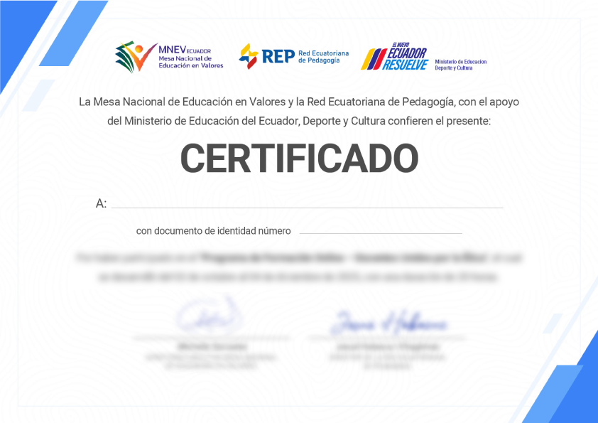 Diez encuentros sincrónicos diseñados para fortalecer las competencias pedagógicas y éticas de docentes del sistema nacional educativo para la enseñanza de Cívica, Ética, Integridad y Valores Humanos a través de un programa de capacitación online, estructurado en módulos temáticos.